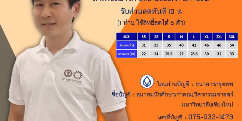 เสื้อสมาคม/มูลนิธิ ครบรอบ 50 ปี คณะวิศวกรรมศาสตร์ มช. จำหน่ายตัวละ 500.-บาท...ฟรีค่าจัดส่ง** พิเศษ **สำหรับสมาชิก Line CMUEAA OFFICIAL รับส่วนลดทันที 10% (1 ท่าน ใช้สิทธิ์ลดได้ 1 สิทธิ์)