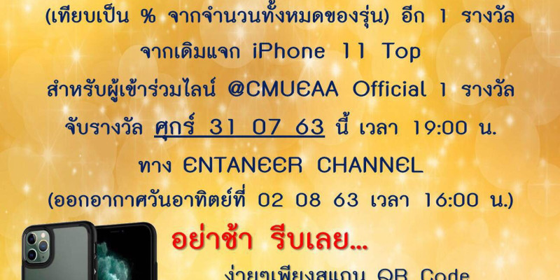 ประกาศรายชื่อผู้โชคดีของรุ่นที่ลงทะเบียนใน Line @CMUEAA Official มากที่สุด.. ???????????????????? ????และมาลุ้นรางวัลใหญ่ iPhone11 TOP กันต่อในรายการ ENTANEER CHANNEL EP.3 งานจับรางวัลสมาชิก Line CMUEAA Official ตอนที่ 3 (Ep.3) กันครับ